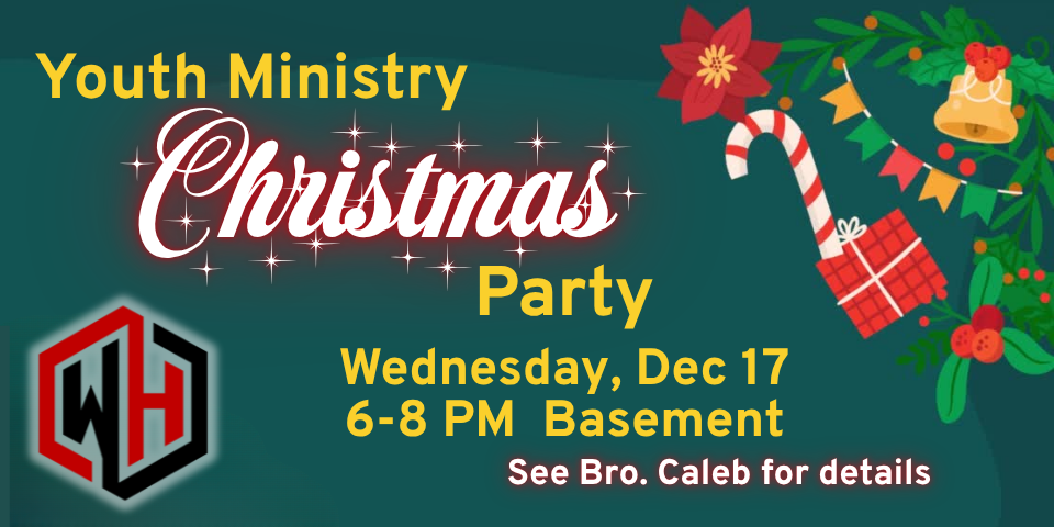 Student Ministry Christmas Party! December 17, 2025 6:00 pm – 8:00 pm Wall Highway Baptist Church Basement 6597 Wall Triana Highway Madison, AL 35757 Get Directions